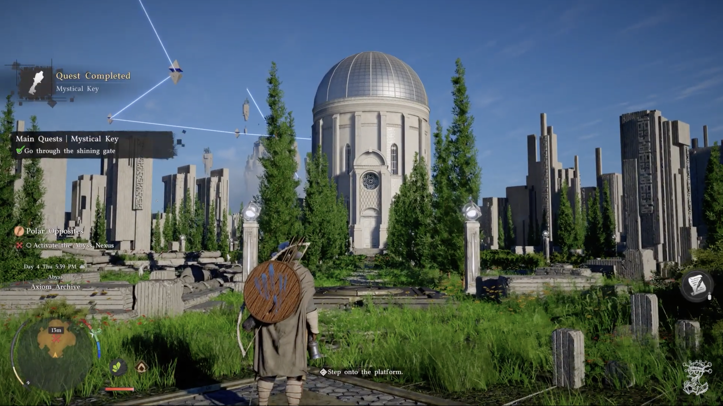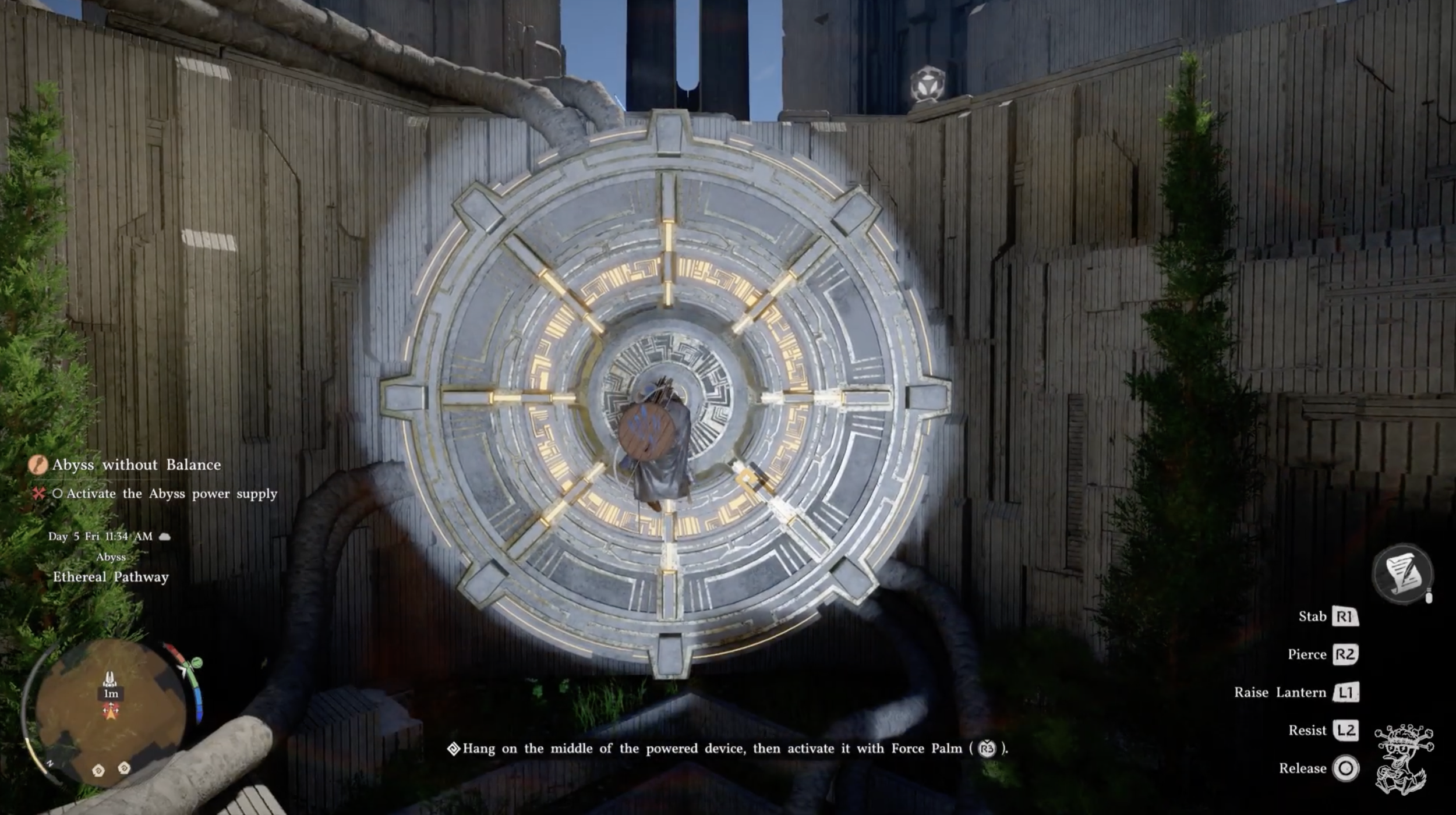 Turn around to your right and start your first puzzle. Use Axiom force to control the two square platforms to redirect the power to the building. Follow the video guide here for more help. Once you spin them to the correct position turn back around and enter the building. A cutscene will begin and you’ll learn a little bit about Kliff and your overall mission of the game. Restore balance between the Abyss and the normal world.