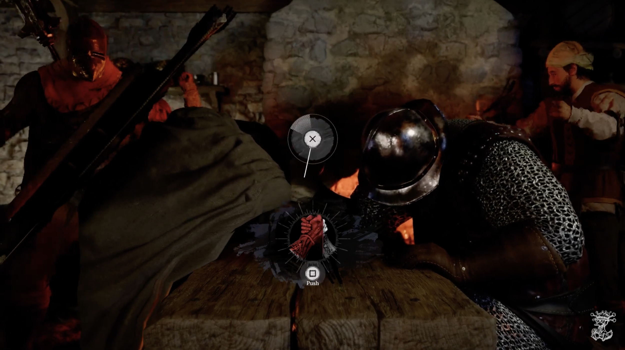 Once you’re done talking to her, move straight ahead to the table in the middle of the room where there is an arm wrestling competition going on. Hold L1 and aim at the table until you see the dialogue to start the competition.