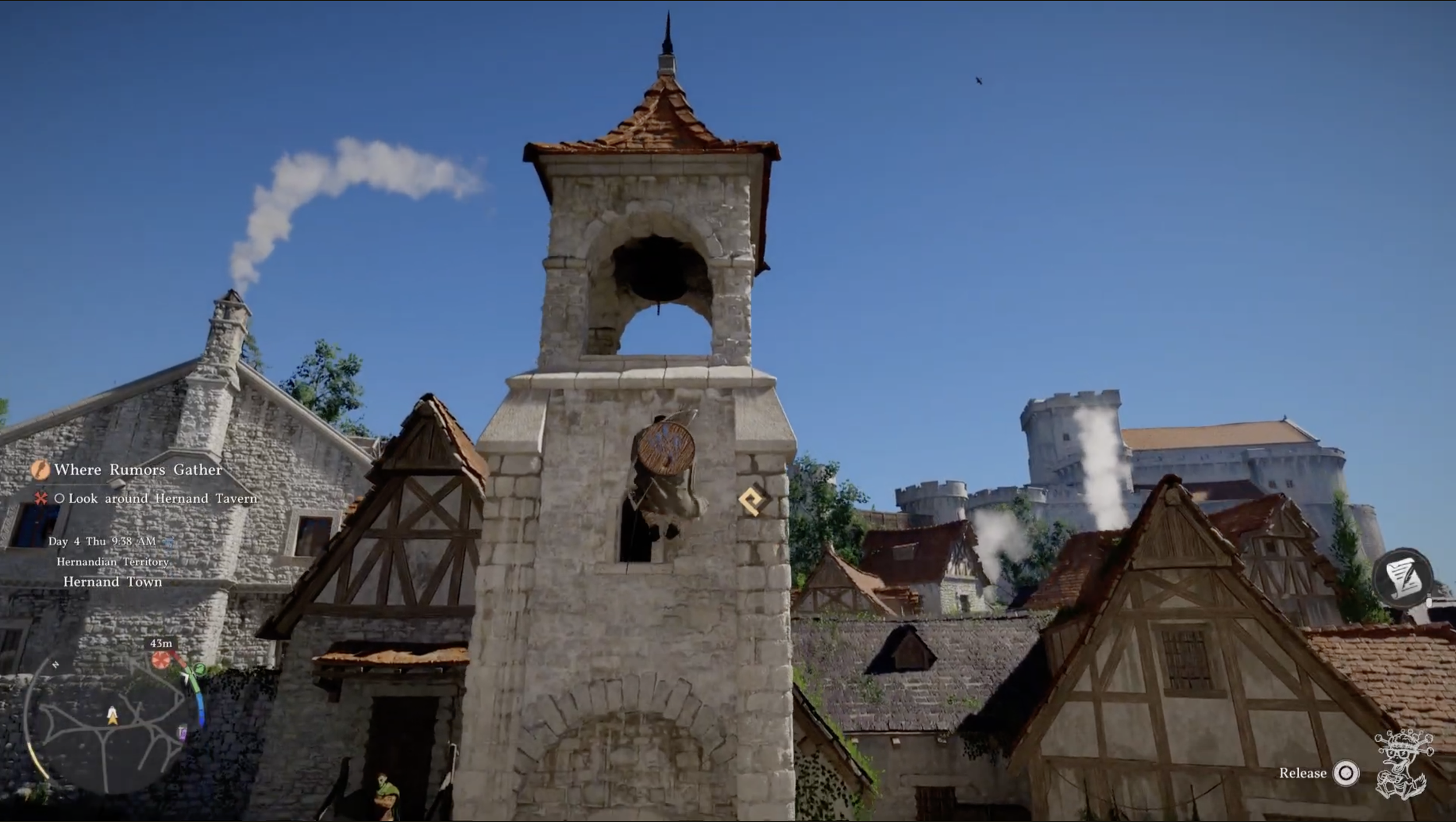First thing youre going to want to do as you enter the town is stop at this small Bell Tower. Once you get to the top you’re going to want to Ring the Bell Tower which is going to dispel the fog on your map for your first section of the game. You’ll meet a magical child in a green outfit who is going to come into play as the game continues. Don’t worry about em now, just keep exploring the town picking up missions. or head straight to the tavern for your first mini game.
