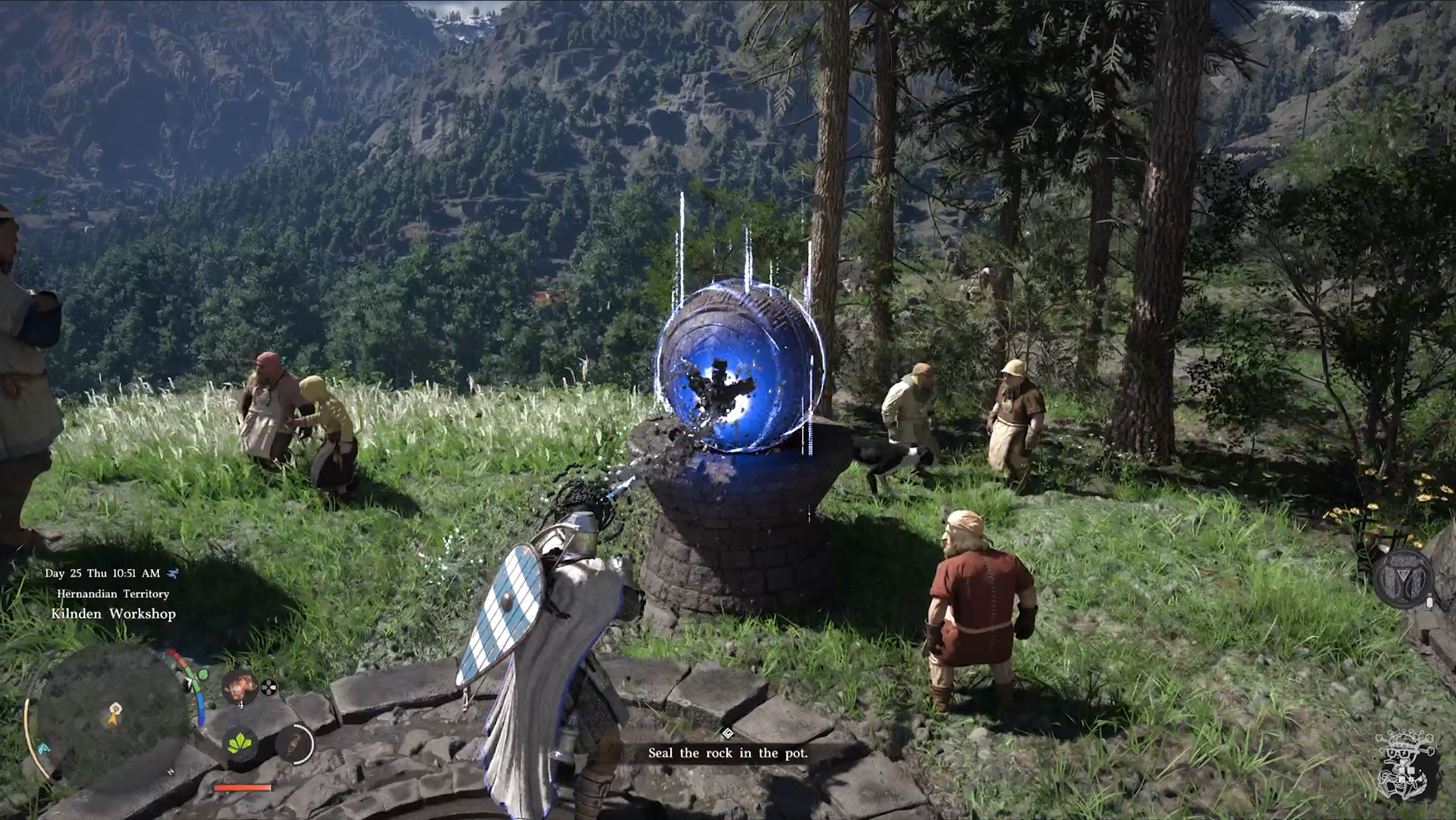 Get close to the rock next to him and it will tell you to push triangle. You will use Axiom Force to grab it and then seal it into your new Kuku Pot. You will find the Kuku Pot in your inventory and when you select it you will see things you’ve sealed in it.