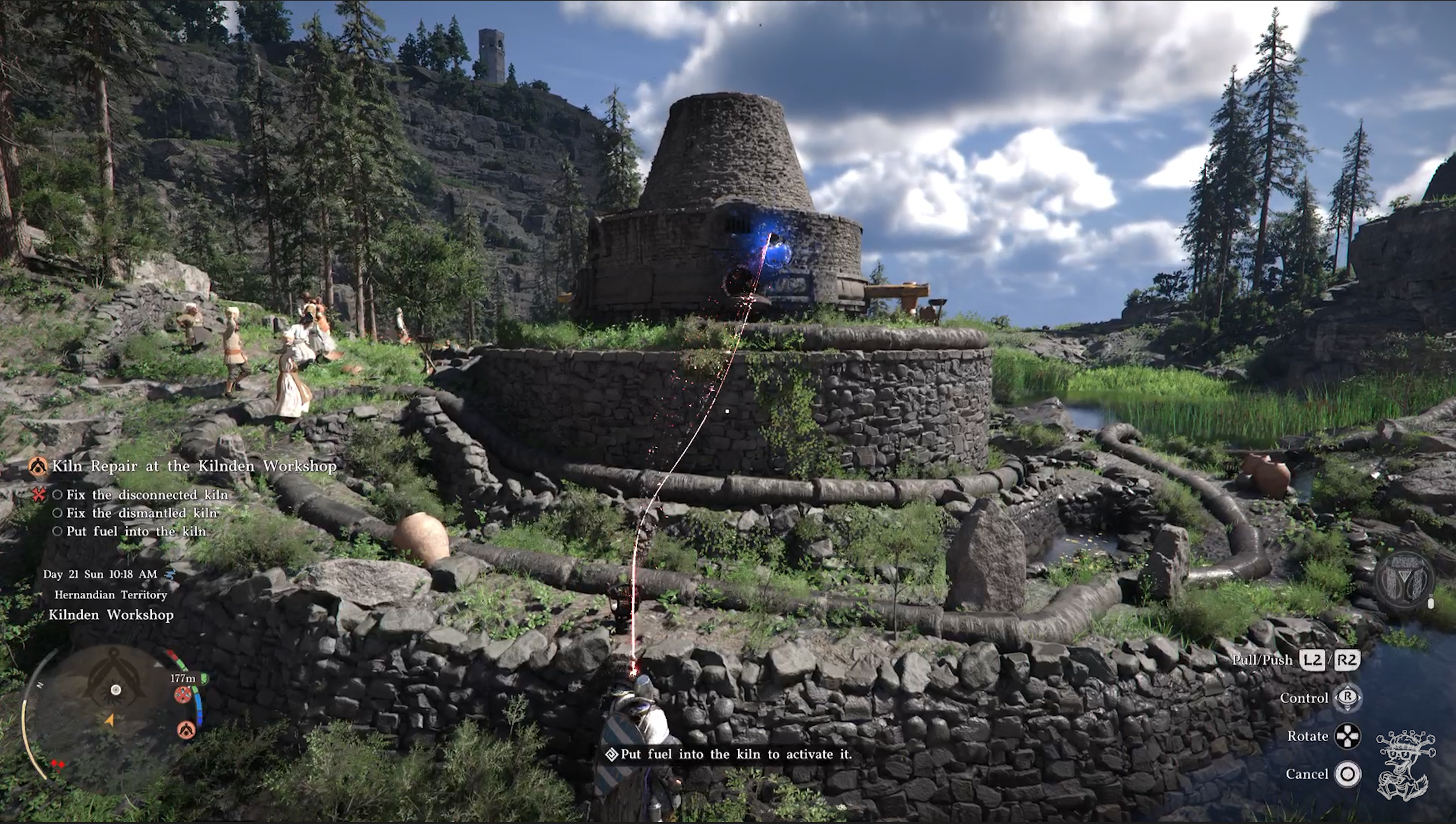 Now the X will be marked on your map to fix the dismantled kiln. Run over there and you will find a kiln broken into pieces. You need to use Axiom Force to lift and spin the pieces and stack them together correctly. Luckily, there are only 2 pieces, one of them being the top with a grate on top, so its pretty easy to figure out.